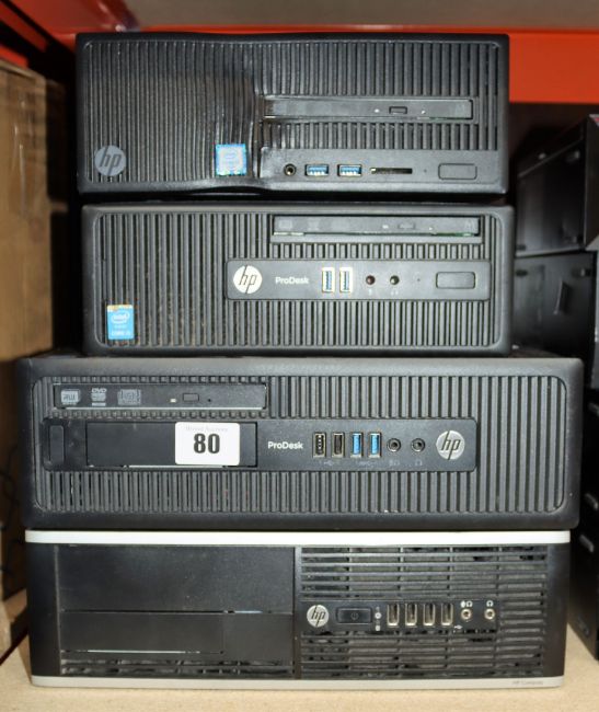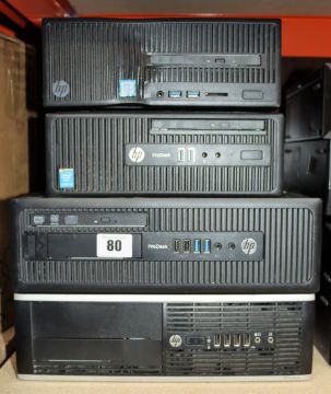 Four pre-owned HP Small Form Factor computers sold for parts; an HP 280 G2 Business PC, an HP ProDesk 400 G2.5 Business PC, an HP Compaq Elite 8300 and an HP ProDesk 600 G1 (All hard drives removed, may have other missing parts/damage).