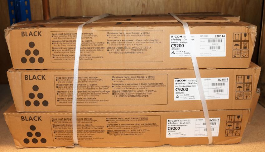 Twelve boxed as new Ricoh Pro C9200 828514 Black Toner Cartridges (Some boxes damaged).