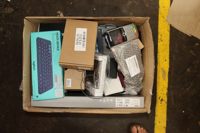A box of assorted as new and pre-owned small electrical items and accessories (All items sold as seen).