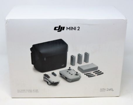 A boxed as new DJI Mini 2 4K Ultra-Light Drone Fly More Combo Bundle (Model: UK MT2PD RC231) (Box sealed, damage to box).