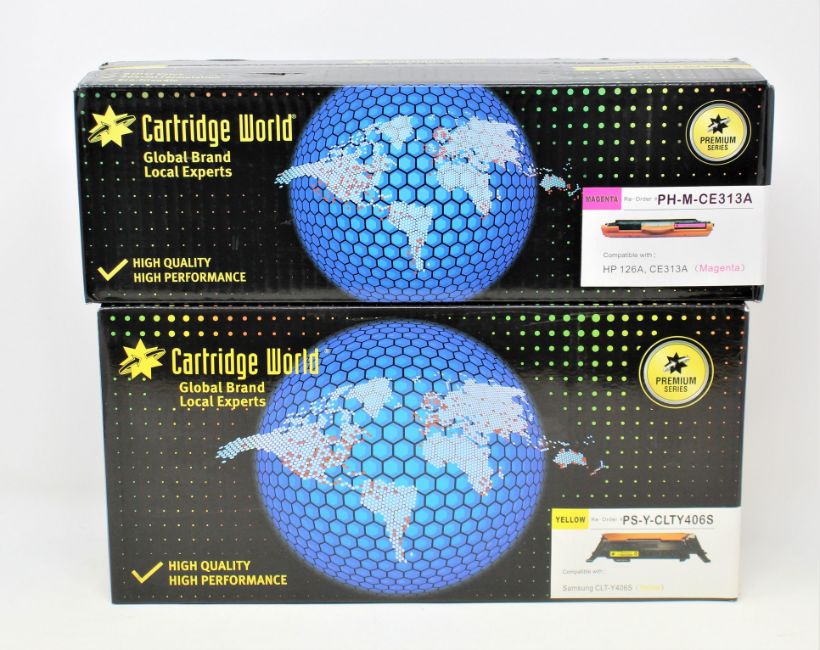 Two boxed as new Cartridge World replacement ink cartridges for HP 305X, CE410X-HY Black (L02-PB-B-CE410X), a boxed as new Cartridge World replacement ink cartridge for HP 126A, CE313A Magenta (L01-PH-M-CE313A) and a boxed as new Cartridge World replacement ink cartridge for Samsung CLT-Y406S Yellow (L01-CW-Y-CLTY406S-1K) (Boxes sealed).