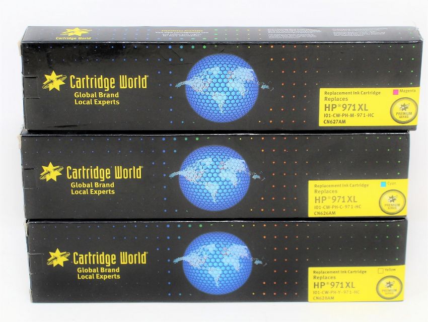 Eleven boxed as new Cartridge World replacement ink cartridges for HP 971XL; 6 x Yellow I01-CW-PH-Y-97 1-HC CN628AM, 4 x Magenta I01-CW-PH-M-97 1-HC CN627AM, 1 x Cyan I01-CW-PH-C-97 1-HC CN626AM.