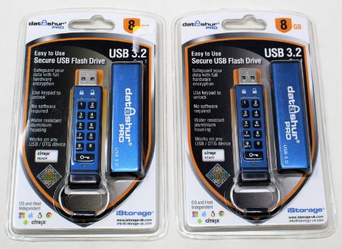 Two as new iStorage datAshur PRO 8GB Secure USB Flash Drives (P/N: IS-FL-DA3-256-8).