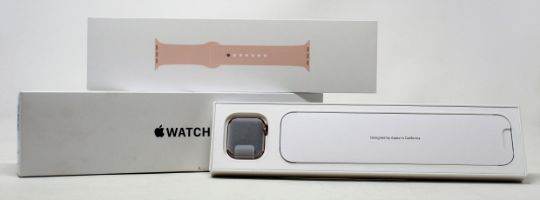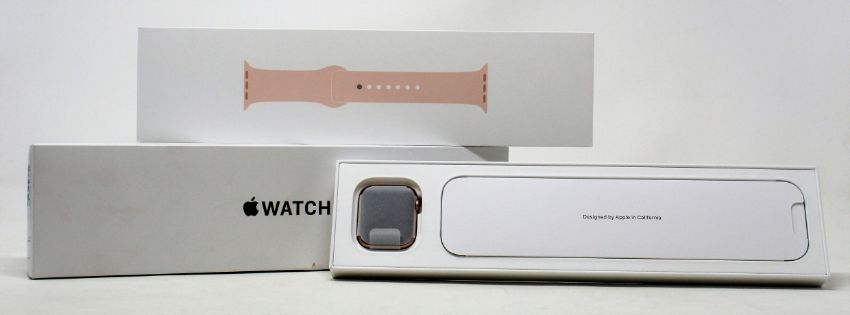 A boxed as new Apple Watch SE GPS 40mm in Gold Aluminium Case with Pink Sand Sports Band (M/N: A2351 MYDN2TY/A) (Box opened, some packaging text in Spanish).