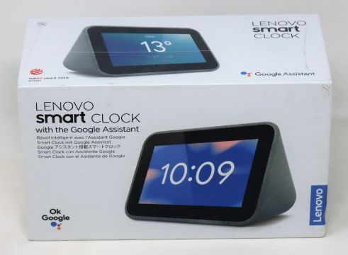 A boxed as new Lenovo Smart Clock with Google Assistant in Hemp (M/N: ZA4R0000GB) (Box sealed, box damaged).
