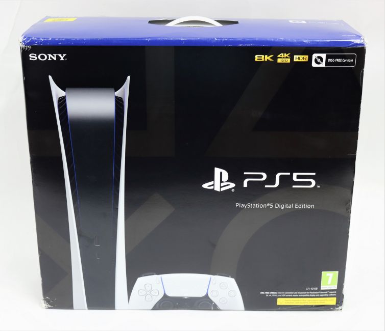 A boxed as new Sony PlayStation 5 Digital Edition Console (EU8 CFI-101B 01Y 220-240V) (Box sealed, some damage to box).