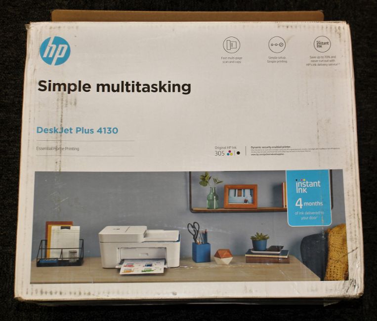 A boxed as new HP DeskJet Plus 4130 All-in-One Wireless Inkjet Printer (Box opened, damage to box).