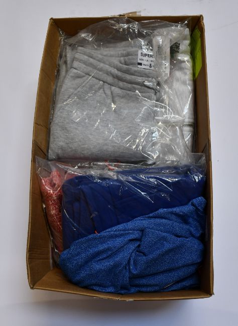 Eight items of as new Superdry clothing; three Orange Label hoodies (UK 12, 14, 16), three pairs of Track & Field joggers (UK 10, 12, 14), Vintage logo T-shirt (XXL) and Keystone crew (L).