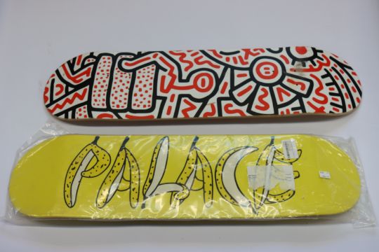 An as new Palace skateboard with banana design (Board may have some minor scratches) and a pre-owned The Skateroom x Keith Haring skateboard (Board has damage to the top and bottom).