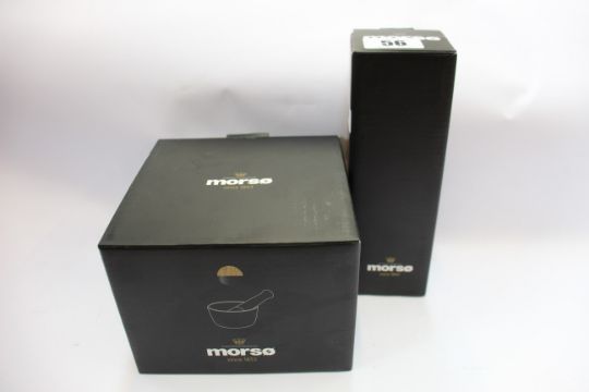 A boxed as new Morso Kit Mortar in oak/cast iron and a boxed as new Morso Kit pepper grinder in oak/cast iron.