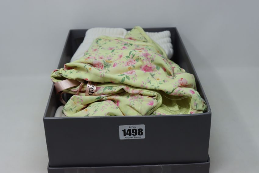 Three items of as new House of CB London clothing; a Tommy off white oversized crew neck sweatshirt (L - RRP £59), a pair of Auden off white jersey shorts (S - RRP £49) and a Vivienne lemon floral corset (S - RRP £79).