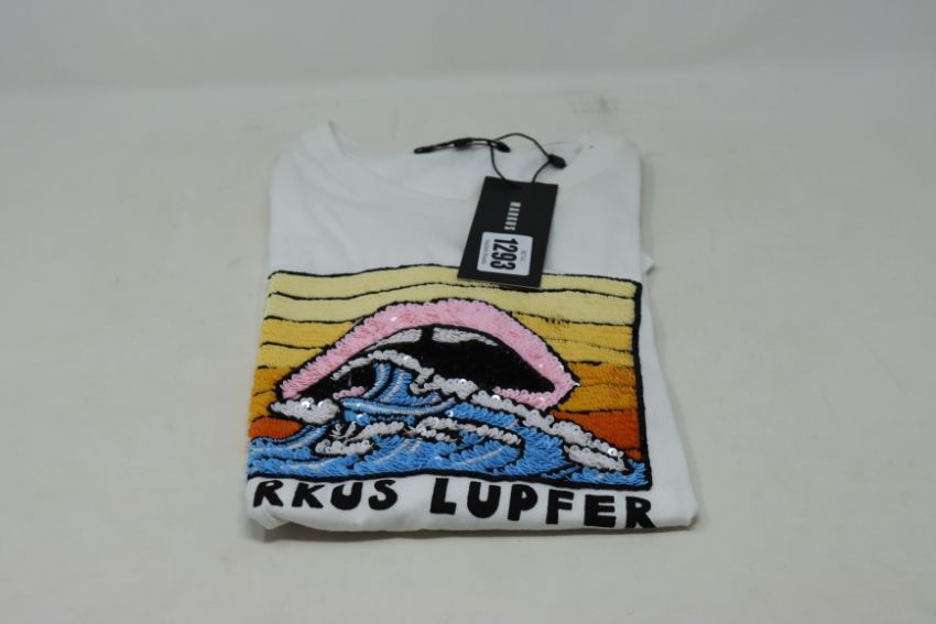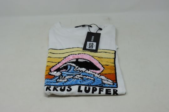 A women's as new Markus Lupfer Kate Sequin Wave Sunset Lip T-shirt (S - RRP £202).