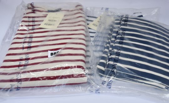 As new Saint James L'Atelier clothing; two Meridien Moderne traditional Breton long sleeve T-shirts (XXL, 3XL - RRP £65 each), two Minquiers Modern Breton tops (L - RRP £55 each), three Galathee II tops (2 x T36, 1 x T44 - RRP £21 each) and an Eve Echarpe scarf.