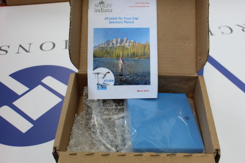 A boxed as new Wolff Indiana Atlas fly tying vice (Pedestal base and material clip).