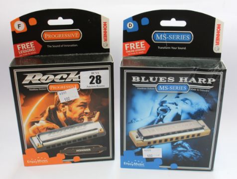5 boxed as new Hohner harmonicas to include; Three a new rocket progressive harmonicas and two boxed as new blues harp MS-Series harmonicas (Some damage to the blues harp boxes).