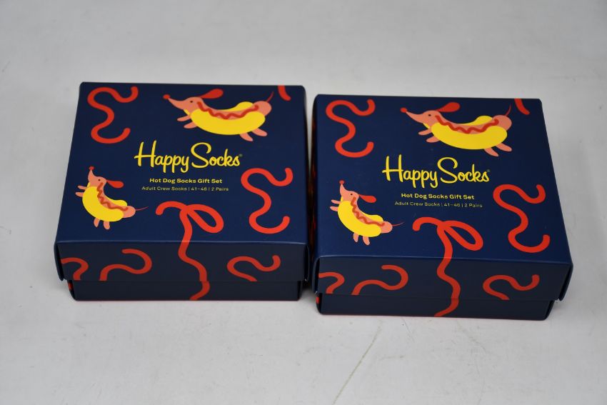 Fifteen boxed as new Happy Socks hot dog socks gift sets.