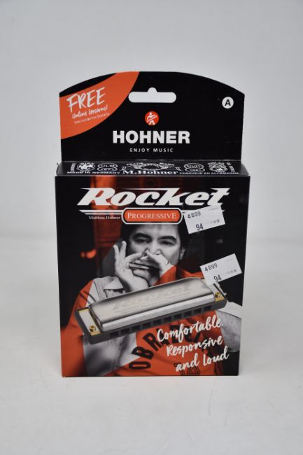 Nine boxed as new Hohner Rocket progressive harmonicas (Five in A, Two in D, One in Eb and one in B).