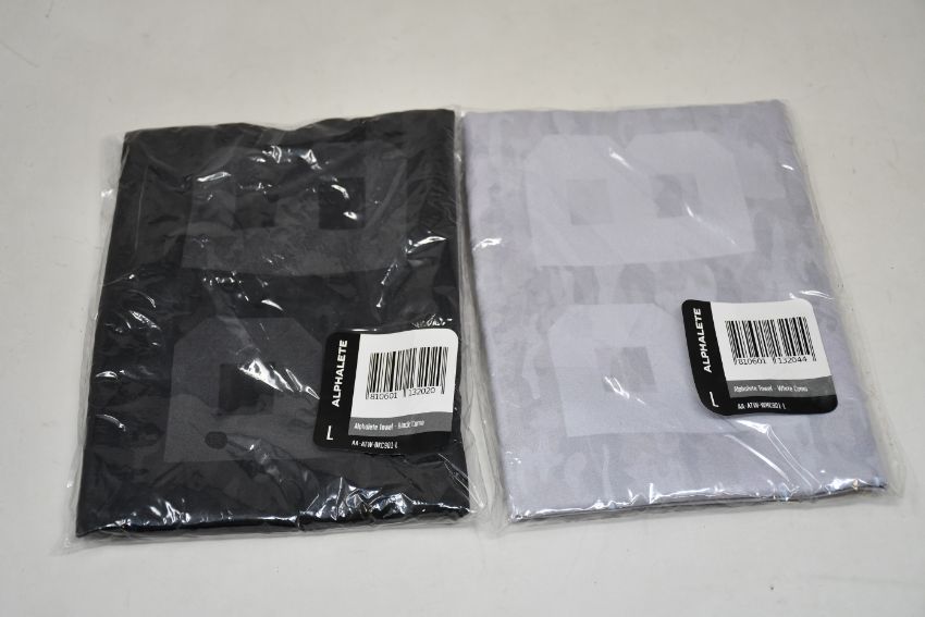 Fifty as new Alphalete PBNS towels; 25 in Silver Camo and 25 in Black Camo (RRP £13.00 each).
