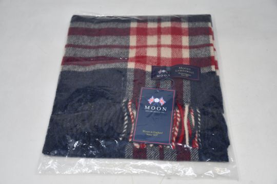 Ten as new Moon Established 1837 Westminster denim tartan merino lambswool scarves.