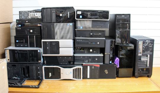 A quantity of pre-owned computers sold for parts to include Dell, Lenovo, ASUS, HP and Custom PC's (Approx. 23 units) (All hard drives removed, some with other missing parts/ damage).