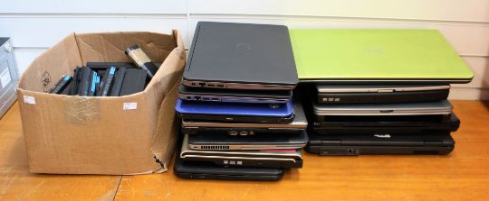SOLD FOR PARTS ONLY - A large quantity of laptops to include Dell, Acer and HP machines (approx. 12 units) (All Drives removed) and a large quantity of untested Dell 60W laptop batteries.