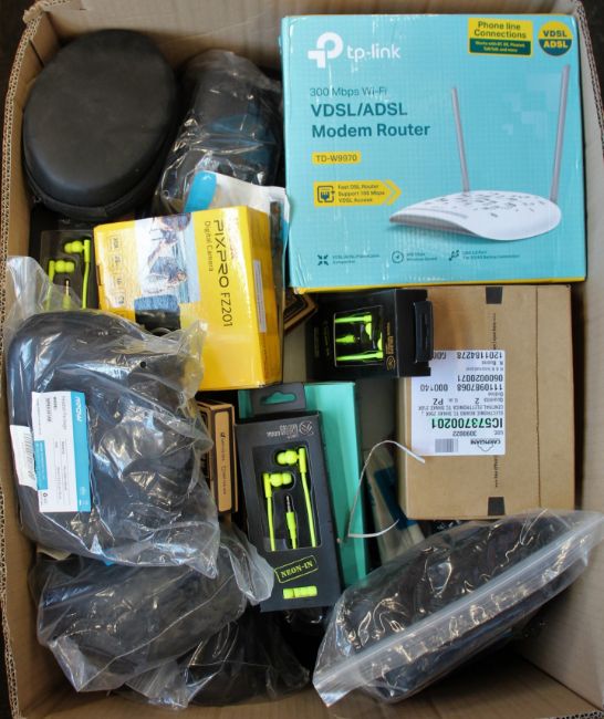 A box of assorted as new and pre-owned small electrical items and accessories (All items sold as seen).