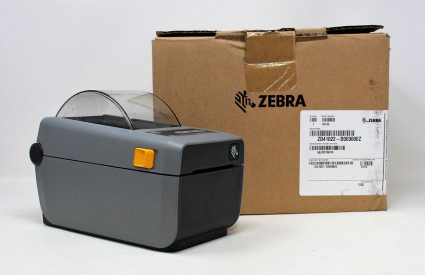 A pre-owned Zebra ZD410 2" Thermal Label Printer (Boxed with power supply and UK plug power cable) (P/N: ZD41022-D0EE00EZ).