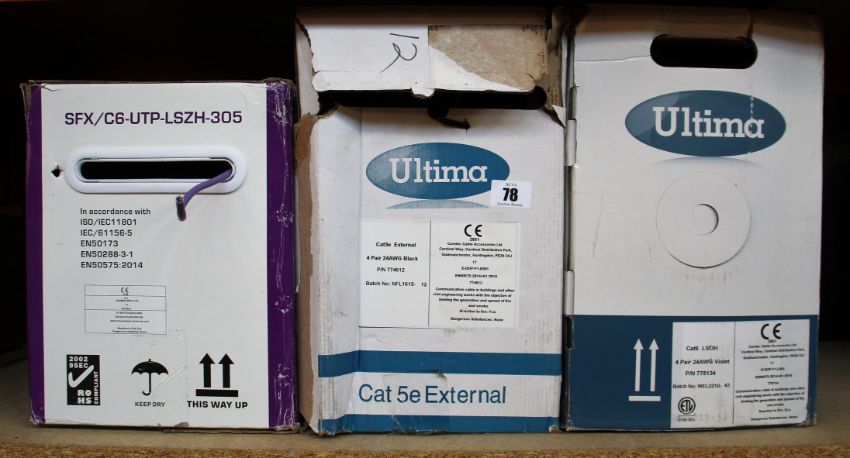A boxed as new reel of Ultima Cat6 Data Cable (P/N: 778134), a boxed as new reel of Ultima Cat5e Data Cable (P/N: 77641) and a boxed as new reel of Premium Category 6 UTP LSZH data cable (MPN: SFX/C6-UTP-LSZH-305)(Some damage to boxes).