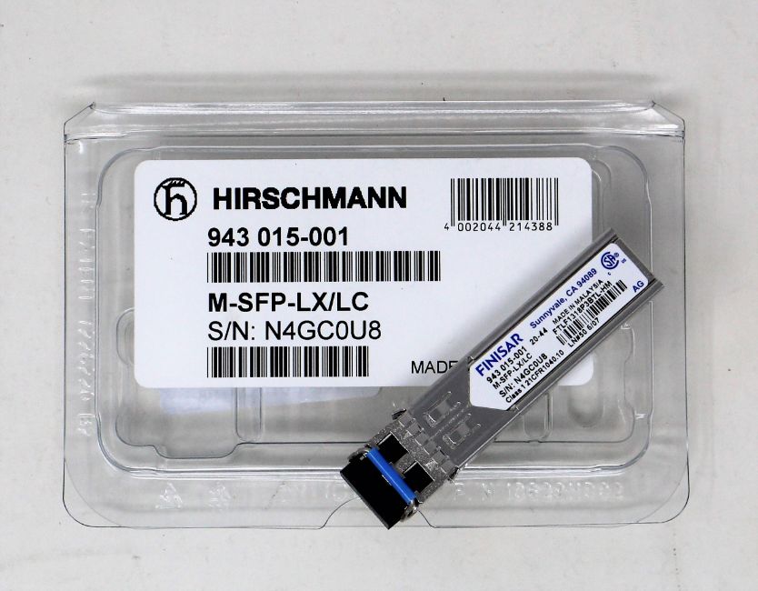 An as new Hirschmann Finisar 943 015-001 M-SFP-LX/LC SFP Fibreoptic Gigabit-Ethernet Transceiver Module.