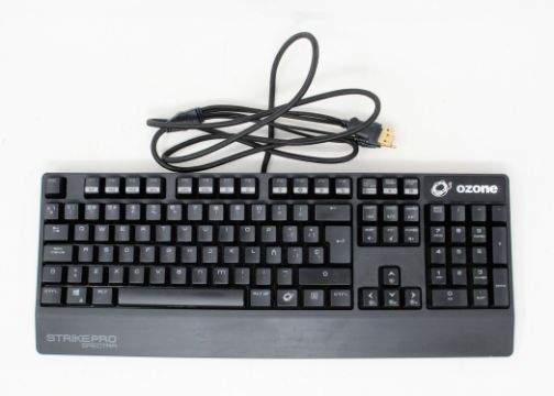 A boxed Ozone StrikePro Spectra mechanical RGB keyboard with cherry red switches. (PLEASE NOTE THAT THIS IS FITTED WITH SPANISH KEY CAPS) (Box very damaged)