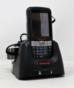 A pre-owned Honeywell Dolphin 60s Mobile Computer Barcode Scanner with cradle and power supply.