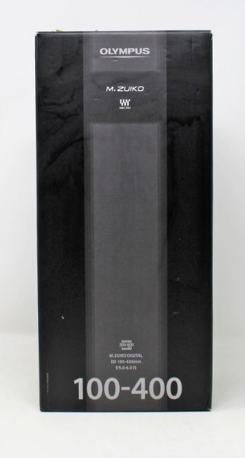 A boxed as new Olympus M.Zuiko Digital ED 100-400mm F5.0-6.3 Zoom Lens in Black (Box opened, damage to box).