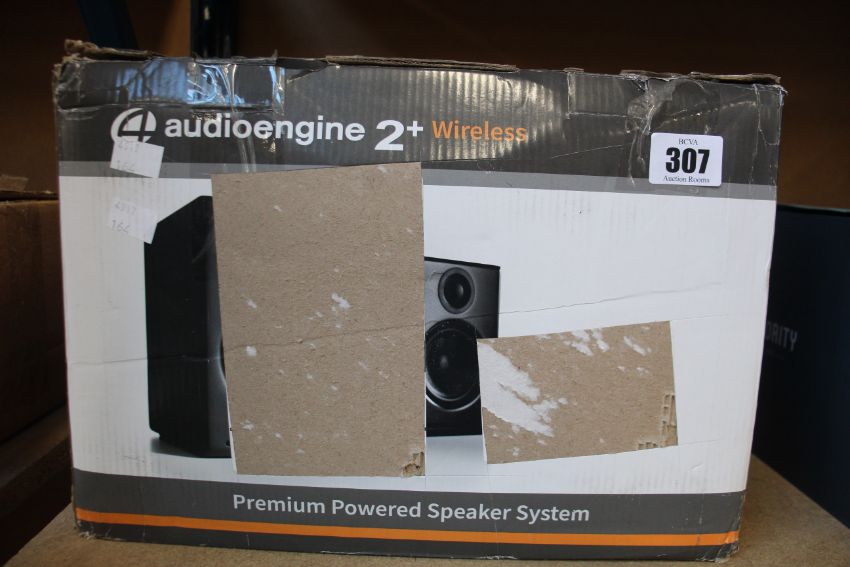 A pair of boxed Audioengine A2+BT Wireless Powered Speakers in white.