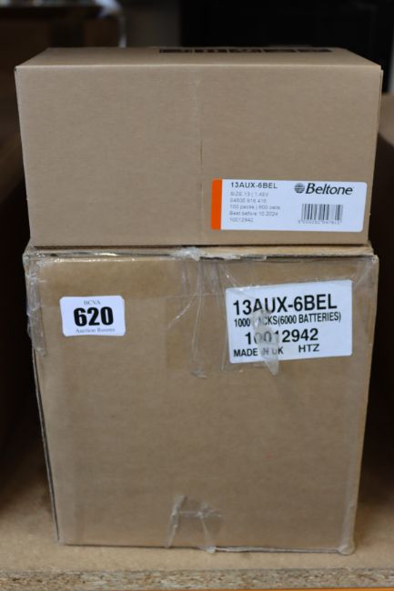 Ten boxes of 100 packs of 6 as new Beltone size 13 hearing aid batteries (13AUX-6BEL, 6000 batteries total).