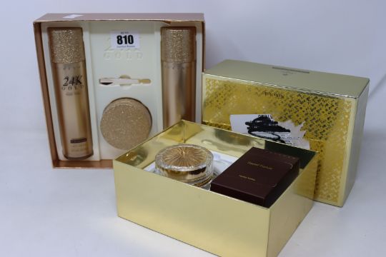 A Holika Holika prime youth 24k gold repair special skin care set ( Label to front of outer box lid) and a Holika Holika prime youth gold capsule (50g) (Label to outer box lid).