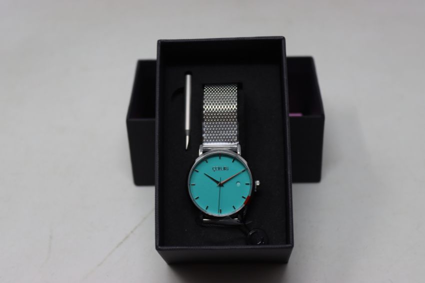 A ladies boxed as new pin-on Coluri Watch in turquoise with a spare strap.