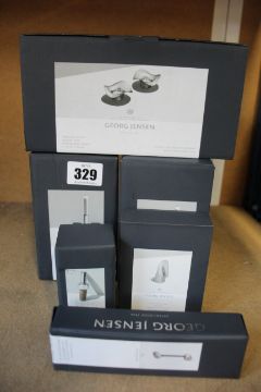 George Jenson accessories - one set of two Cobra Tealight Holders, two Tunes Collection Candleholders, one Lumis Collection Snuffer, one Manhattan Collection Wine Stopper and one Elephant Key Ring, all as new.