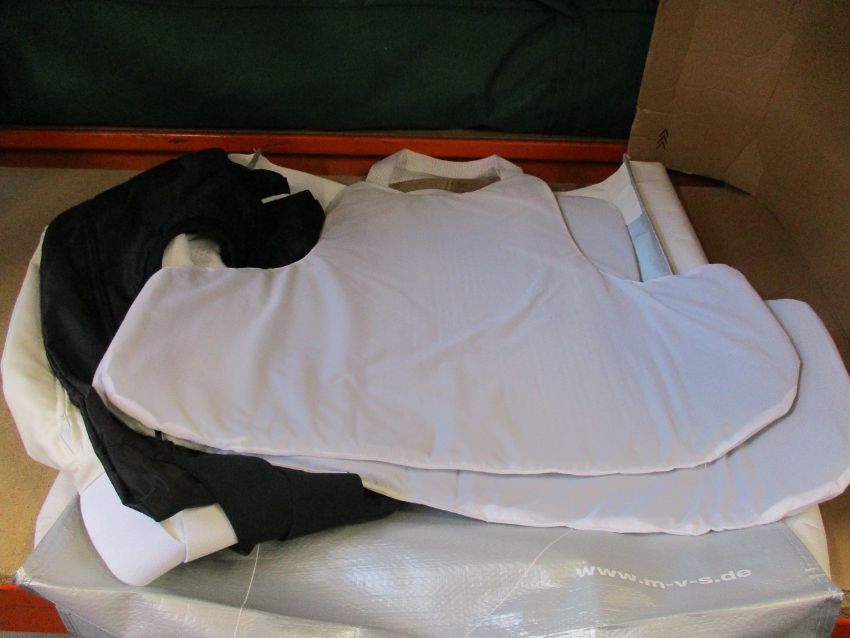 Two as new Mehler Comfort II body armour vests (One in black and one in white) and as new Mehler front and back protection padding (HG1A + KR1) (Armour model: CA0671A).