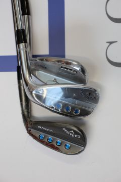 Three pre-owned right-handed golf clubs to include; A Mizuno T20 wedge (Good condition) and Two Callaway jaws MD5 wedges (One with damage to grip, one with damage to golf head).