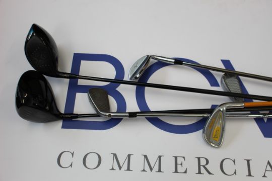Six pre owned golf clubs in varying conditions to include a Mizuno T20 wedge, Patriot UK Young Gun 2 mid size and a Titleist 915 D2.
