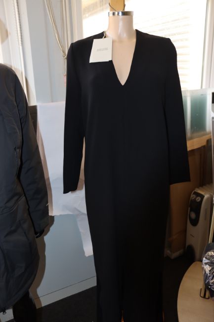 An as new Mark Kenly Domino Tan Demetra long V-neck dress with buttoning in black (Size 34).