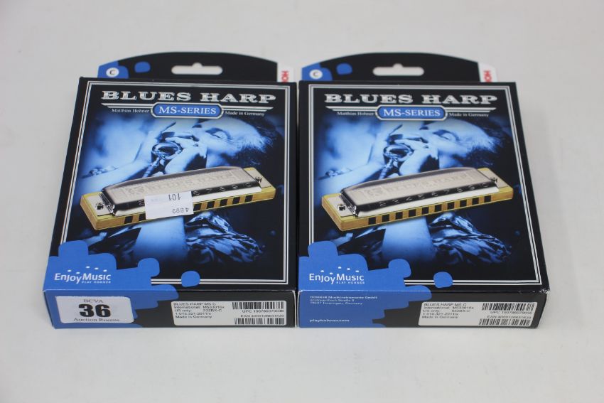 Ten boxed as new Hohner MS-Series Blues Harp harmonicas.
