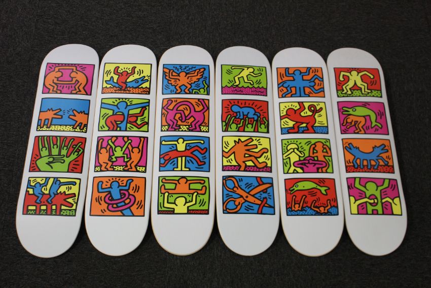 A set of as new Keith Haring - Retrospect 1939 Wall Art Skateboards (Set of 6 boards, each deck measures 80 x 20cm approximately, some minor markings to the tips of some boards).