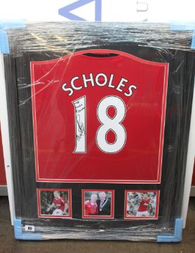 A framed No.18 Manchester United shirt signed by Paul Scholes (To Hugh Ridgway) via Allstar Signings.