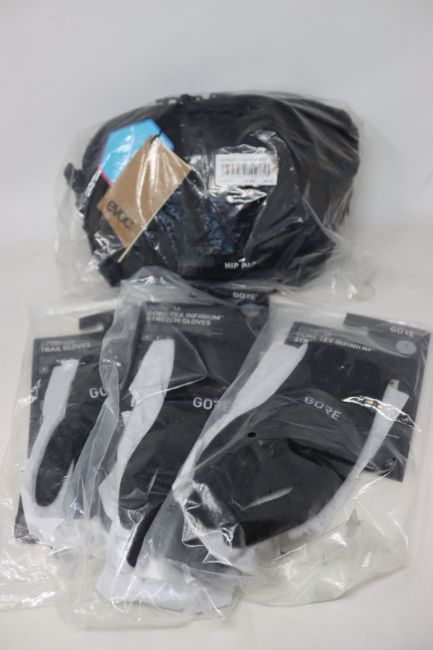An as new Evoc Hip Pack 3+ (1.5l bladder), a Gore C5 jersey (M), a pair of Revolution Race Nordwand trousers (M) and five pairs of assorted Gore cycling gloves.