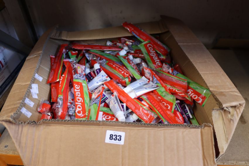 A large quantity of children's Colgate toothbrushes and 20ml Colgate maximum cavity protection kids toothpaste.