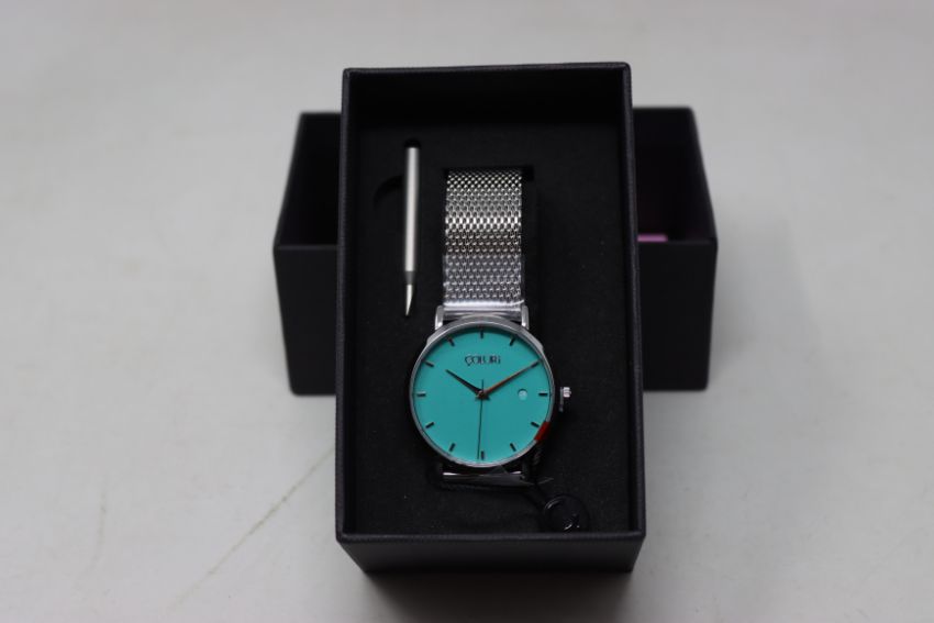 A ladies boxed as new Coluri Watch in turquoise with a spare strap.