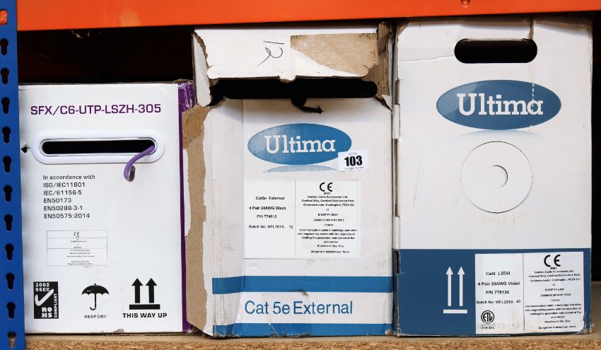 A boxed as new reel of Ultima Cat6 Data Cable (P/N: 778134), a boxed as new reel of Ultima Cat5e Data Cable (P/N: 77641) and a boxed as new reel of Premium Category 6 UTP LSZH data cable (MPN: SFX/C6-UTP-LSZH-305)(Some damage to boxes).