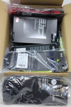 Assorted as new Gore cycling clothing; men's GTX Practice pants (XXL), R5 shorts (L), M base layer boxer shorts (XL), M Windstopper base layer sleeveless shirt (XXL), C3 Mid socks, M Mid socks and M Brand Mid socks.