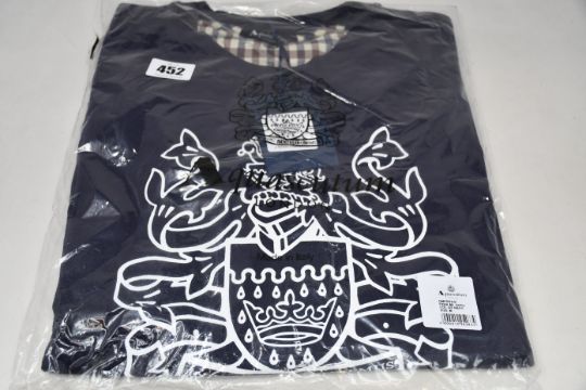 Two as new Aquascutum large crest crew neck navy sweatshirts (M - RRP £80 each).